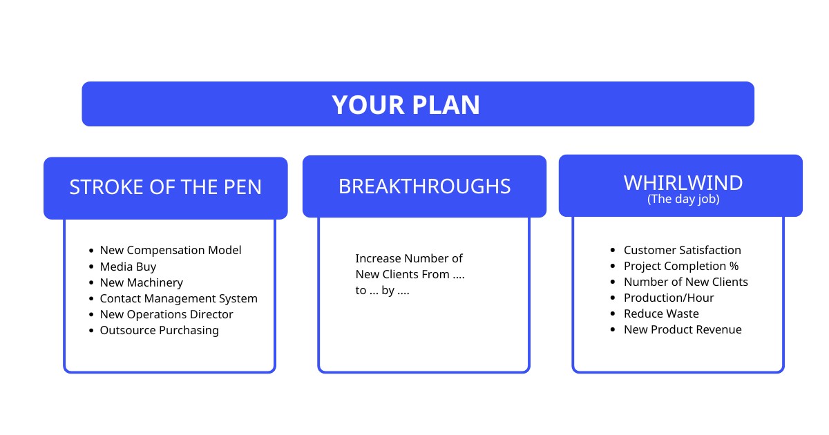 Cột thứ 2: “Breakthroughs” (nghĩa: những mục tiêu đột phá). Đây là những mục tiêu cực kỳ quan trọng nhưng có rủi ro rất lớn là sẽ không đạt được. Gọi chung là Mục tiêu tối quan trọng (Wildly Important Goals® - WIGs). Ví dụ như: Tăng số lượng khách hàng mới, xây dựng mô hình kinh doanh số hóa hoàn toàn, tăng doanh thu lên gấp 3 trong năm mới,... Mặc dù những mục tiêu này thường xuất phát từ hai cột còn lại nhưng chúng không thể hoàn thành bằng các cách làm thông thường. Một Breakthroughs không thể đạt được chỉ bằng “Stroke of the Pen” – tổ chức không thể ra lệnh hay chi tiền để nó xảy ra cũng như là từ các quy trình hiện tại. Thay vào đó, chúng chỉ đạt được khi tổ chức vận hành theo cách khác, và hầu hết đều đòi hỏi thay đổi hành vi cùng sự tham gia, gắn kết cao của con người.